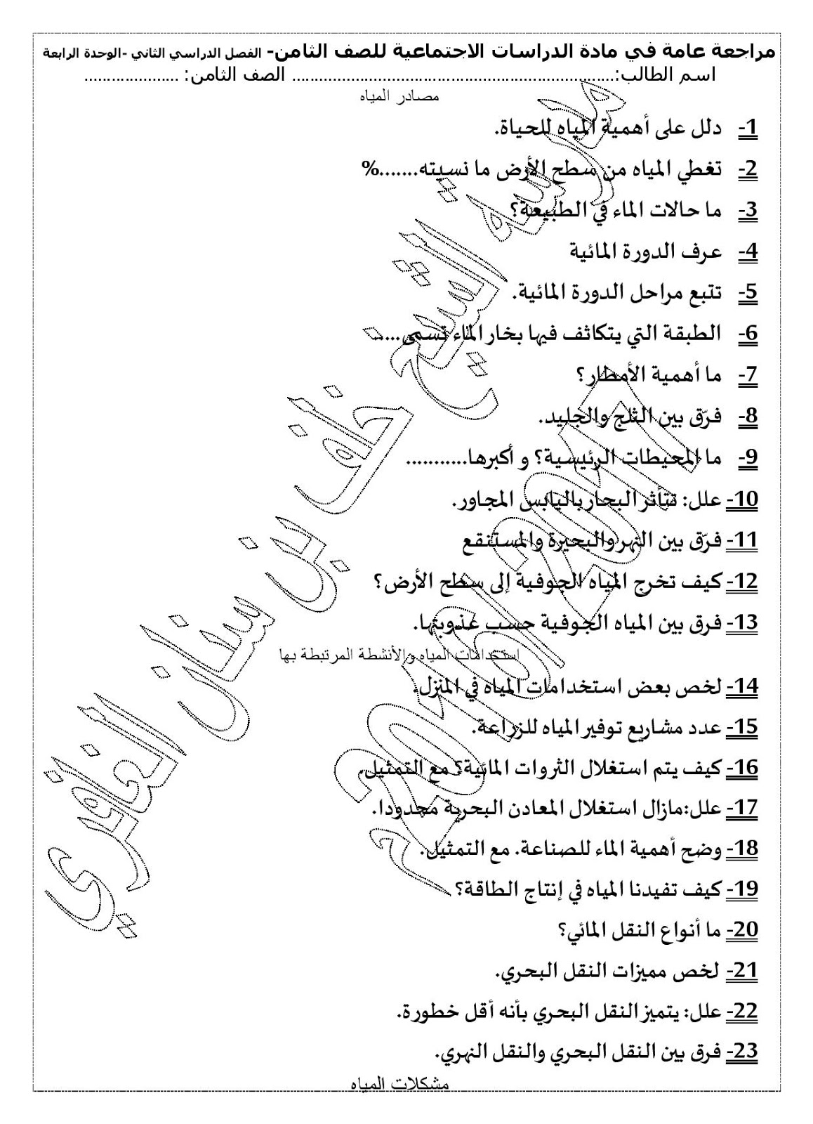اسئلة على وحدة دورة المياة الطبيعية للصف الثامن الفصل الثاني