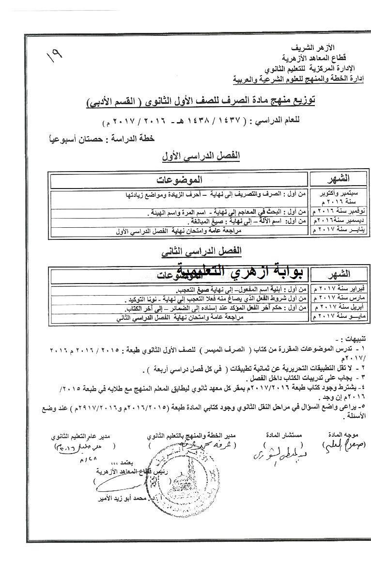 الخطة الدراسية للمرحلة الاعدادية شرعي وعربي 2017