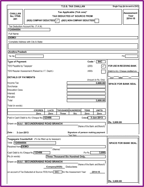 Tds Challan 281 Filled Format